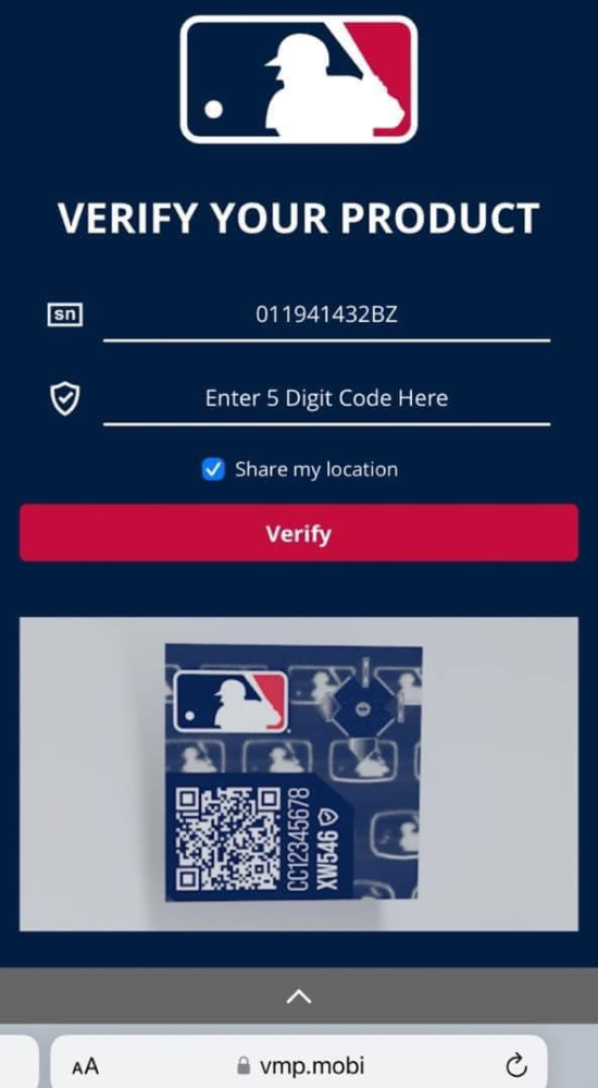 - Khi ứng dụng đã quét mã thành công, nó sẽ hiển thị các thông tin thông báo chứng nhận sản phẩm là chính hãng, được sản xuất và phân phối bởi MLB .