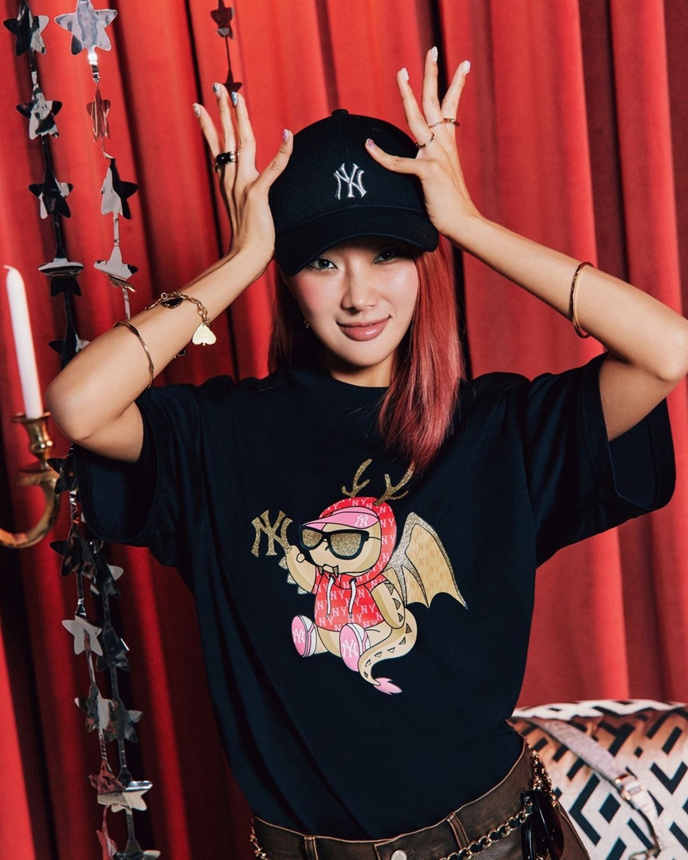 Phiên bản tiếp theo có phần mạnh mẽ và cá tính hơn khá nhiều. Áo Thun MLB Korea New Year Dragon New York Yankees Black làm nên chất ngoài ấn tượng với nền màu đen điển hình, đây chính là một trong những lựa chọn hấp dẫn nhất với nhiều bạn trẻ vì tính thuận tiện, phù hợp với nhiều kiểu phối đồ khác nhau. Thay vì tạo dáng cực ngầu như phiên bản áo màu kem, bé rồng trên chiếc áo này chọn cho mình một dáng ngồi thoải mái và cực kỳ dễ thương trong bộ trang phục MLB màu hồng.